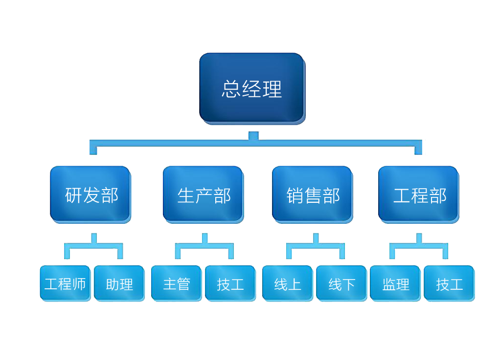 公司主要分為四大部門(mén):研發(fā)部、生產(chǎn)部、銷(xiāo)售部和工程部。最高權(quán)利機(jī)構(gòu):總經(jīng)理主要負(fù)責(zé)公司的經(jīng)營(yíng)決策、公司制度的審批以及人員聘用等方面的重大決策。以下是公司組織結(jié)構(gòu)圖。