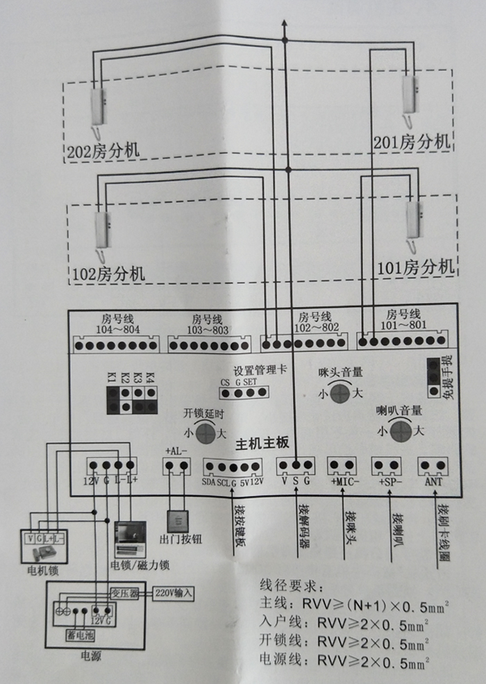 4)系統最大支持32戶,呼叫時,對應分機振鈴,響鈴時間50秒,無人接聽時自動切斷并進入待機狀態;