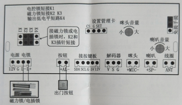 1、設置管理卡: 設備在斷電的狀態下短接主板上的"G”和“管理卡”插針,然后上電(上電后可去除短接,也可保留)進入設置管理卡和刪除卡模式。接著刷待注冊的[管理卡]。再刷待注冊的I刪除卡]。兩張卡片刷完后斷電去除短接再上電,完成設置工作。